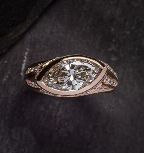 18ct pink gold, diamond set dress ring, the centre stone is a 3ct marquise cut diamond surrounded by 0.65cts of round brilliant cut diamonds set in pavé style.